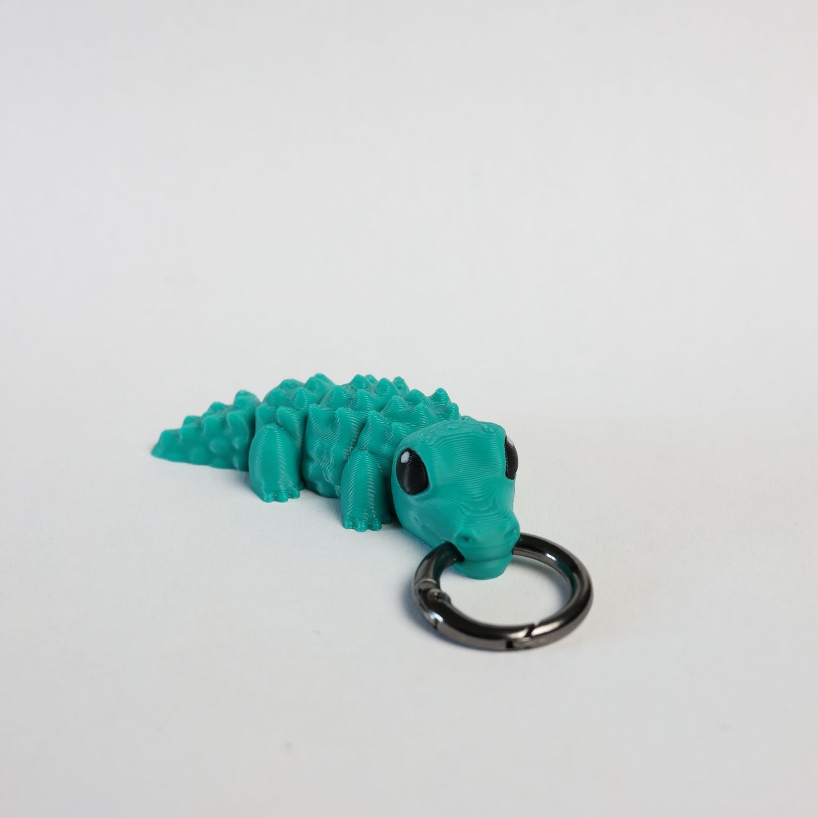A SD printede alligator kychain featuring a segmented, articulated design .